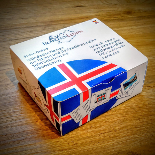 This box contains flash cards of 1000 common nouns of all Icelandic declension paradigms together with their German and English translations. On the front side of each card you will find the respective illustrated noun. On the back you will find the declension of the noun with and without the article. In addition,the front side draws attention to which vowel changes, contractions and consonant insertions to apply when declining.
